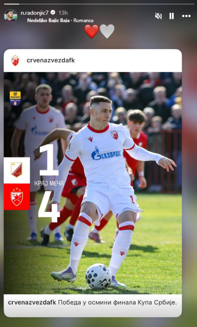 Naravno, meč nije propustio, pa je na Instagramu posle ubedljive pobede postavio fotografiju Duereta uz crveno-i belo srce i muzičku pozadinu, pesmu "Romansa" od Nedeljka Bajica.