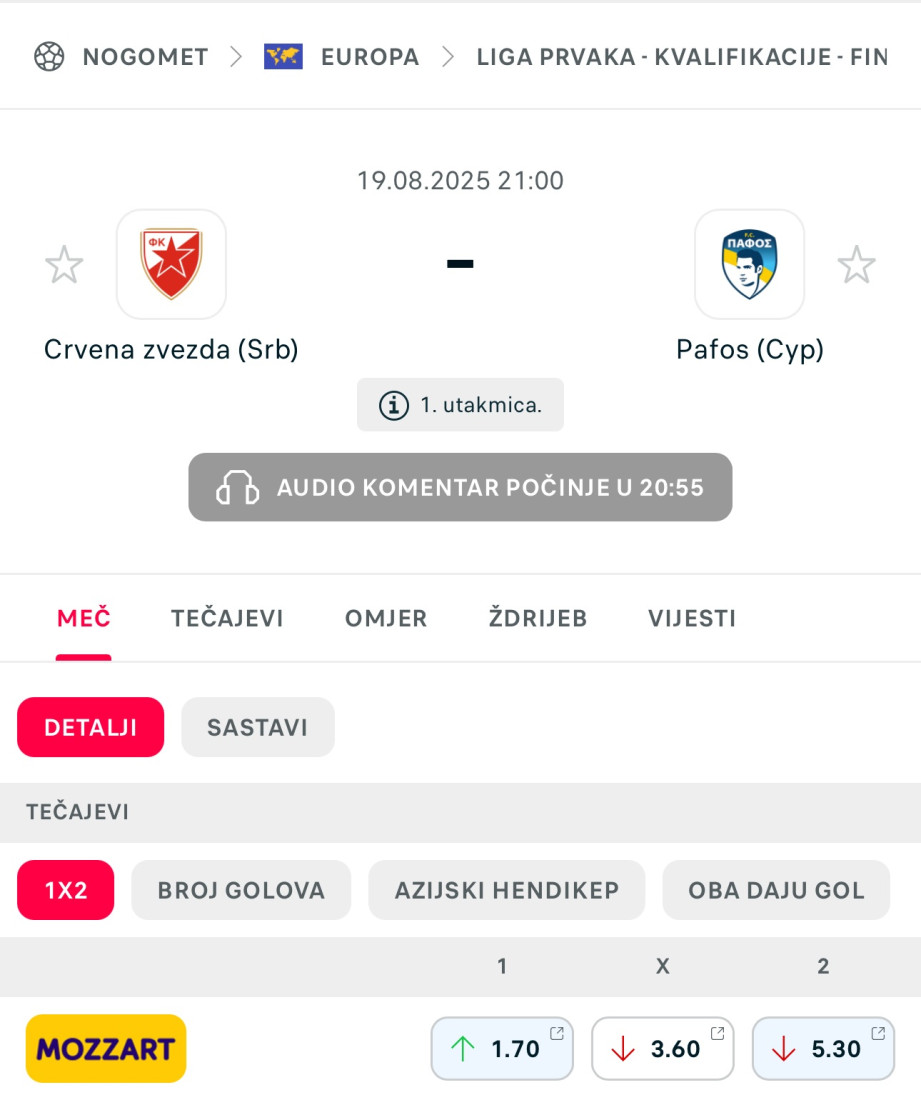 Prednost je nesumnjivo na strani crveno-belih, a tu činjenicu potvrđuju i bukmejkerske procene na sam dan utakmice. Kvota na pobedu Crvene zvezde iznosi 1,70, dok se eventualni trijumf Pafosa vrednuje koeficijentom 5,30. Mogućnost remija kotira se na 3,60.