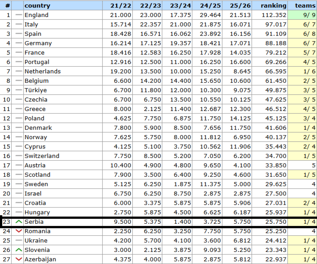 Ne bi bilo loše da Srbija dođe do makar 22. pozicije, što bi garantovalo da prvak kreće od drugog kola kvalifikacija za Ligu šampiona sledeće i u sezoni 2027/2028. Realno je da se Srbija nađe ispred Mađarske, zaostatak je minimalan 0,187, ima 25,937 bodova. Ferencvaroš je izgubio od Ludogoreca u prvom meču plej-ofa za plasman u osminu finala Lige Evrope (2:1). Sledećeg četvrtka ćemo navijati da Bugari u revanšu u Budimpešti odbrane prednost iz prvog sudara sa Fradijem.