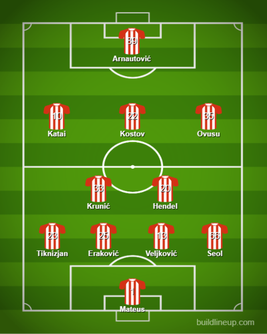 Kao što smo gore i najavili, Arnautovića i Kataija bi trebali da gledamo od starta, dok bi po desnoj napadačkoj strani trebalo da deluje Daglas Ovusu, što znači da će Vladimir Lučić ovog puta biti na klupi, kao i Džej Enem.