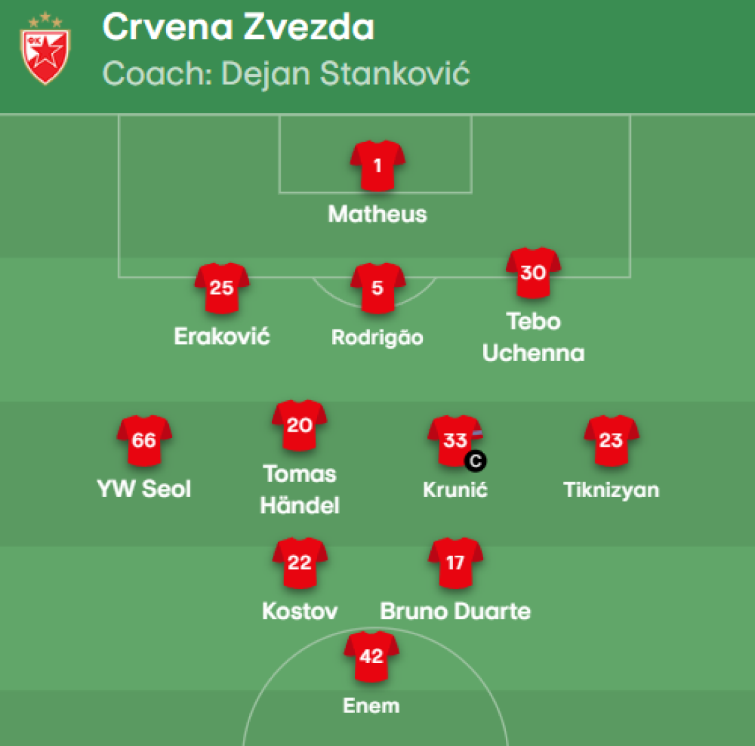 Crvena zvezda: Mateus - Eraković, Rodrigao, Tebo Učena - Seol, Hendel, Krunić, Tiknizjan - Kostov, Duarte - Enem