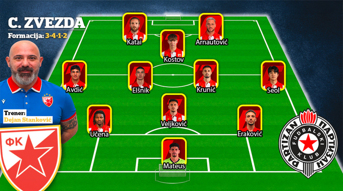 Očekivani sastav Crvene zvezde: Mateus – Eraković, Veljković, Tebo – Seol, Elšnik, Krunić, Avdić – Kostov – Arnautović, Katai.