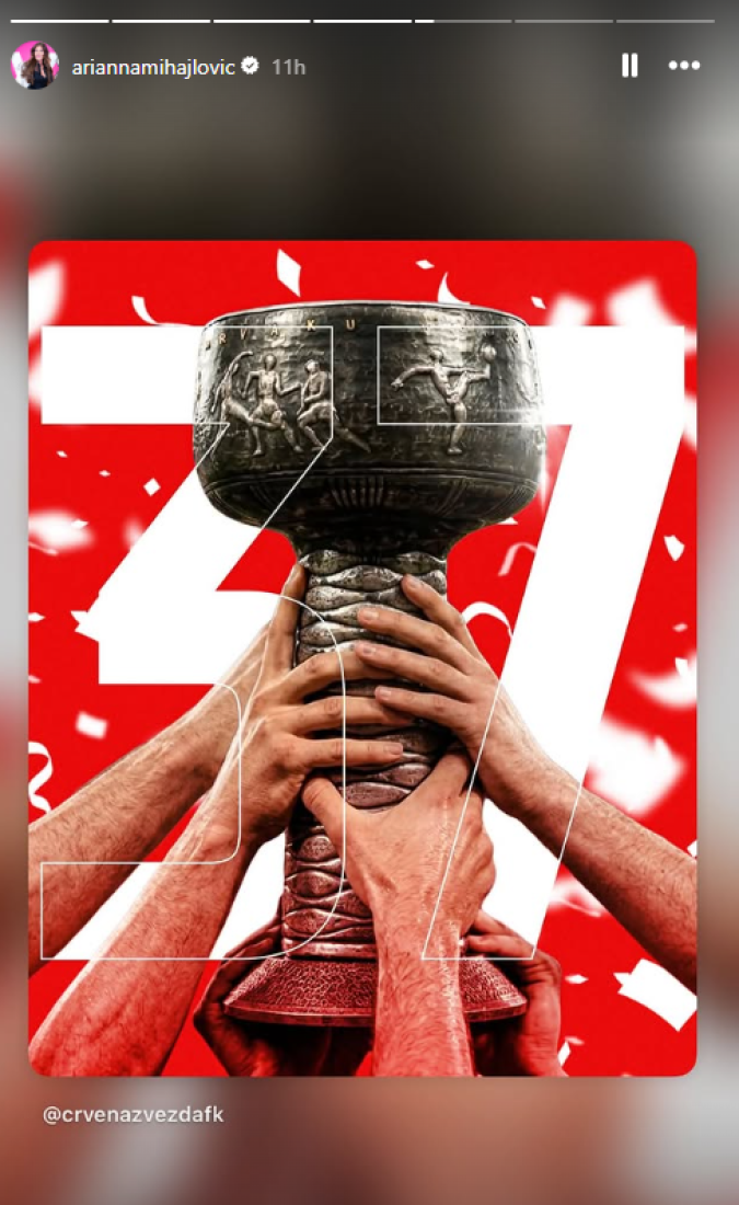Arijaana je nakon pobede na Instagramu podelila fotografiju pehara u rukama Zvezde, dok je uz emotikon srca komentarisala i zajedničku fotografiju kuma Dejana Stankovića, koji je bio u društvu Aleksandra Kataija i Mirka Ivanića.