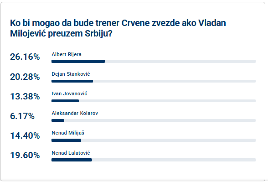 Rijera je dobio 26,16 odsto glasova anketiranih, drugo mesto pripalo je Dejanu Stankoviću za koga je glasalo 20,28 odsto, dok je za Nenada Lalatovića bilo 19,60 odsto.