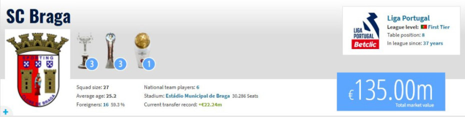 Kapiten Rikardo Horta (31) vredi šest miliona evra manje, dok napadač Pau Viktor (23) i vezista iz Obale Slonovače Mario Dorgeles (21), imaju tržišnu vrednost od po deset miliona evra. Golman Lukaš Horniček (23) procenjuje se na oko osam miliona evra, isto koliko i defanzivni vezista Siku Nijakit (26) iz Malija, kao i mladi Gabrijel Moskardo (20).