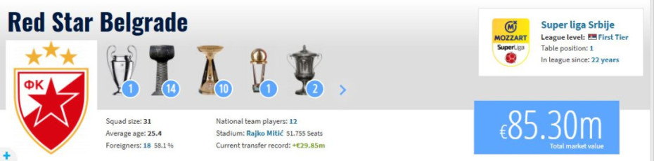 Aktuelni šampion Srbije, s druge strane, trenutno u sastavu broji 31 fudbalera, čija vrednost prema podacima pomenutog fudbalskog sajta iznosi 85.30 miliona evra.