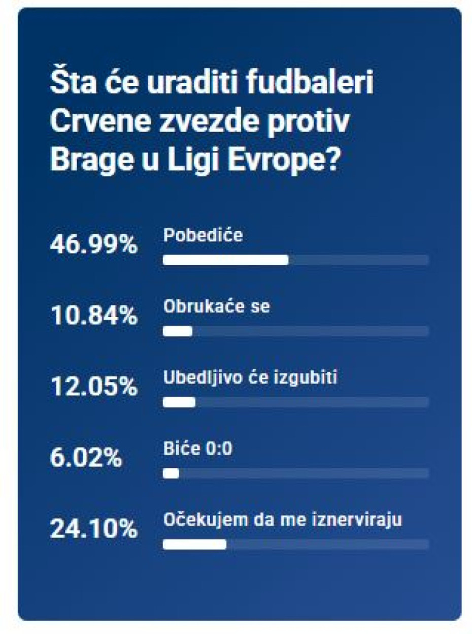 Srpski prvak večeras (18.45, RTS1, Arena premijum 1) gostuje "nadbiskupima" na popularnom "Kamenolomu" u meču 3. kola Lige Evrope. Prema anketi sprovedenoj na sajtu Sportinjo.rs, gotovo 47% čitalaca veruje da će crveno-beli ostvariti pobedu na severu Portugala.