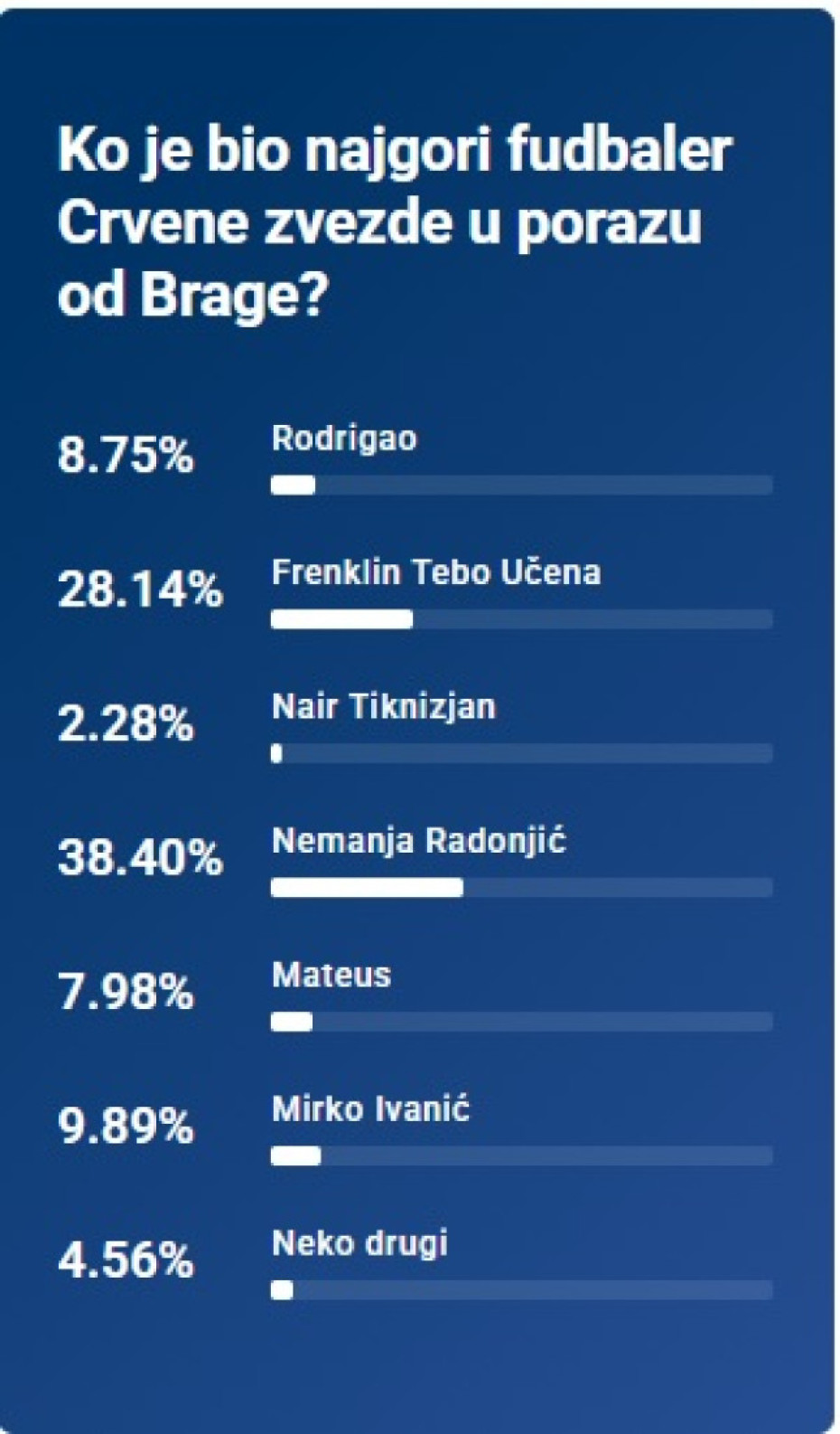 Iza njega je štoper Rodrigao, a pojedini navijači nisu štedeli ni golmana Mateusa, koji je definitivno najbolji fudbaler crveno-belih od starta sezone. Kompletne procente možete pogledati u fotografiji ispod.