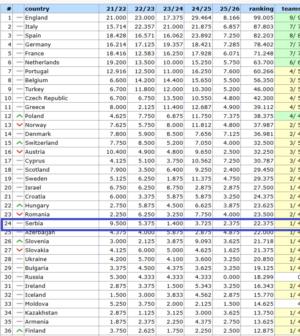 Pitanje je da li će Srbija uspati da napreduje s 24. pozicije. Završetak sezone ispod granice 22. mesta na klupskoj listi UEFA imaće ozbiljne posledice. Šamopion Srbije u sezoni 2027/28. moraće da startuje od prvog kola kvalifikacija za Ligu šampiona.