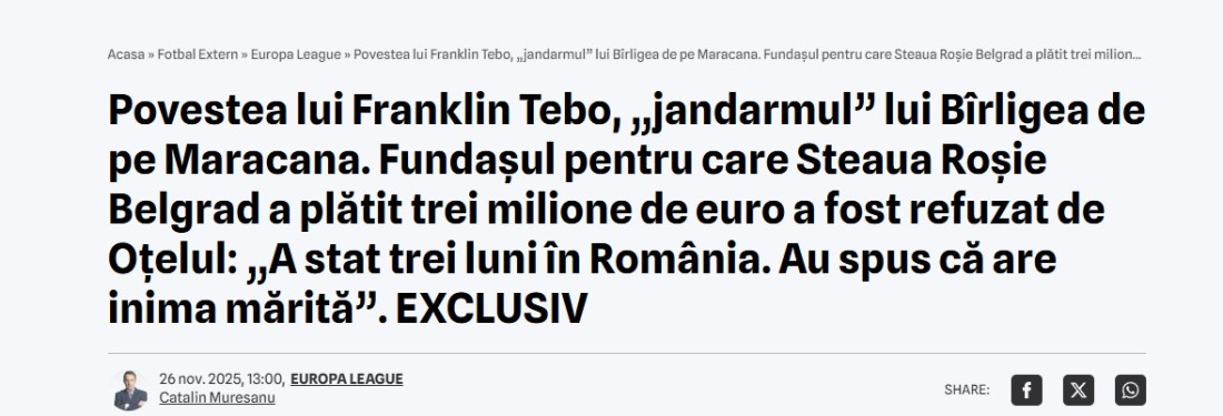 Jedan dan pred meč Crvene zvezde i FCSB u Beogradu, rumunski portal "ProSport" objavio je priču o Tebu Učeni, koji je svojevremeno pokušao da se nametne tamošnjem klubu.