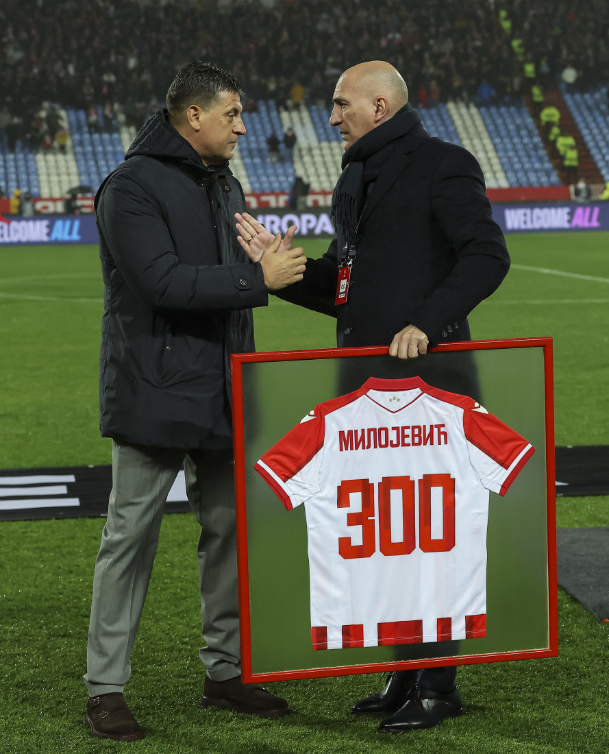 1. minut - Upravo je počela utakmica na "Marakani"! Uoči meča sportski direktor Crvene zvezde Mitar Mrkela uručio je treneru Vladanu Milojeviću dres sa brojem 300, za isto toliko vođenih utakmica na klupi srpskog prvaka.