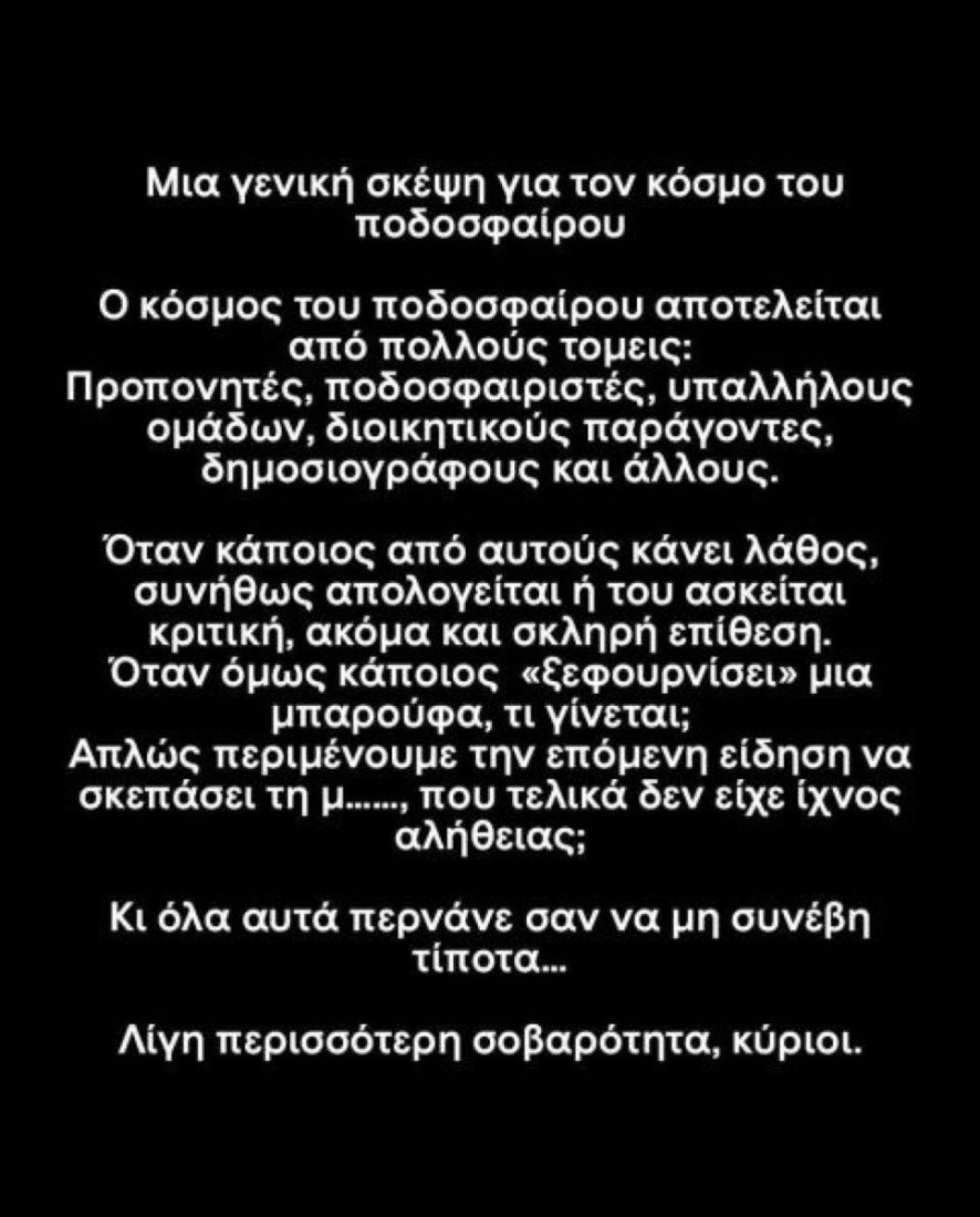 "Jedna opšta misao o svetu fudbala. Svet fudbala se sastoji od mnogo činilaca: trenera, fudbalera, klupskih zaposlenih, upravljačkih kadrova, novinara i drugih. Kada neko od njih pogreši, obično se izvini ili bude kritikovan, čak i žestoko napadnut. Ali kada neko izvali glupost, šta se dešava? Samo čekamo sledeću vest da pokrije onu prethodnu glupost koja nije imala ni trunku istine? I sve to prođe kao da se ništa nije dogodilo… Malo više ozbiljnosti, gospodo", napisao je Teoharus na svom profilu.