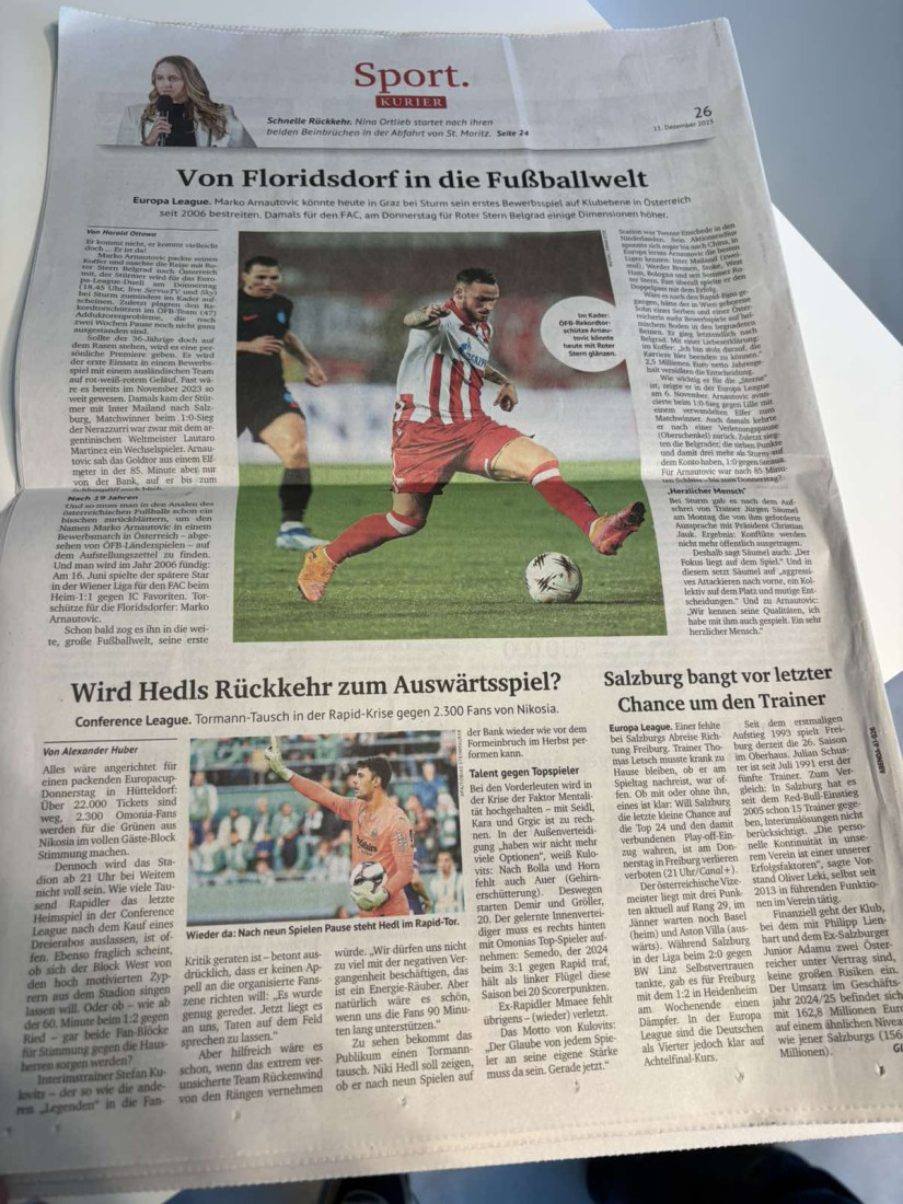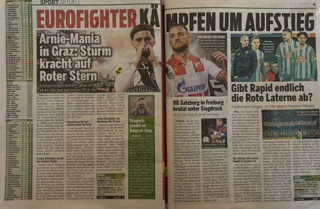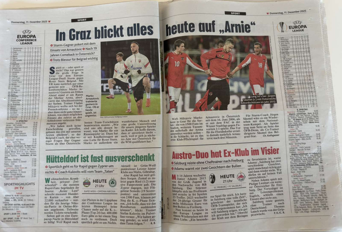 Popularni "Kurier" je u prvi plan stavio Marka Arnautovića, napadača Zvezde, reprezentativca i legendu Austrije. U fokusu im je da li će nastupati ili ne. Postojale su šanse da letošnje pojačanje crveno-belih uopšte ni ne doputuje u Grac, međutim, oporavak od povrede tekao je bolje od očekivanog, pa se on našao u avionu.