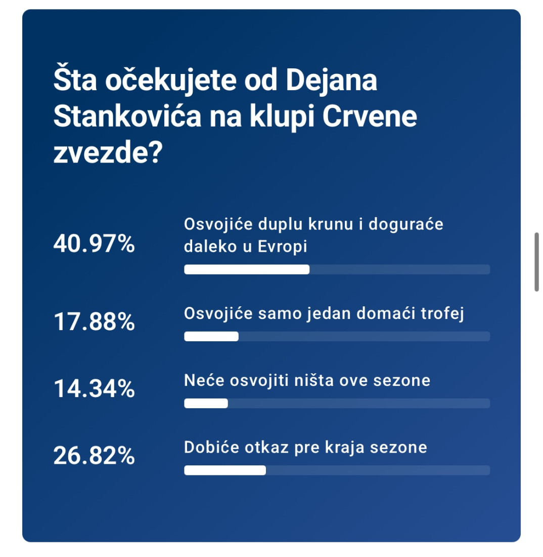 Što se tiče opcije da Stanković osvoji samo jedan domaći trofej, za nju je glasalo 17,88%, dok je za opciju da će ostati bez trofeja ove godine, glasalo 14,34%.