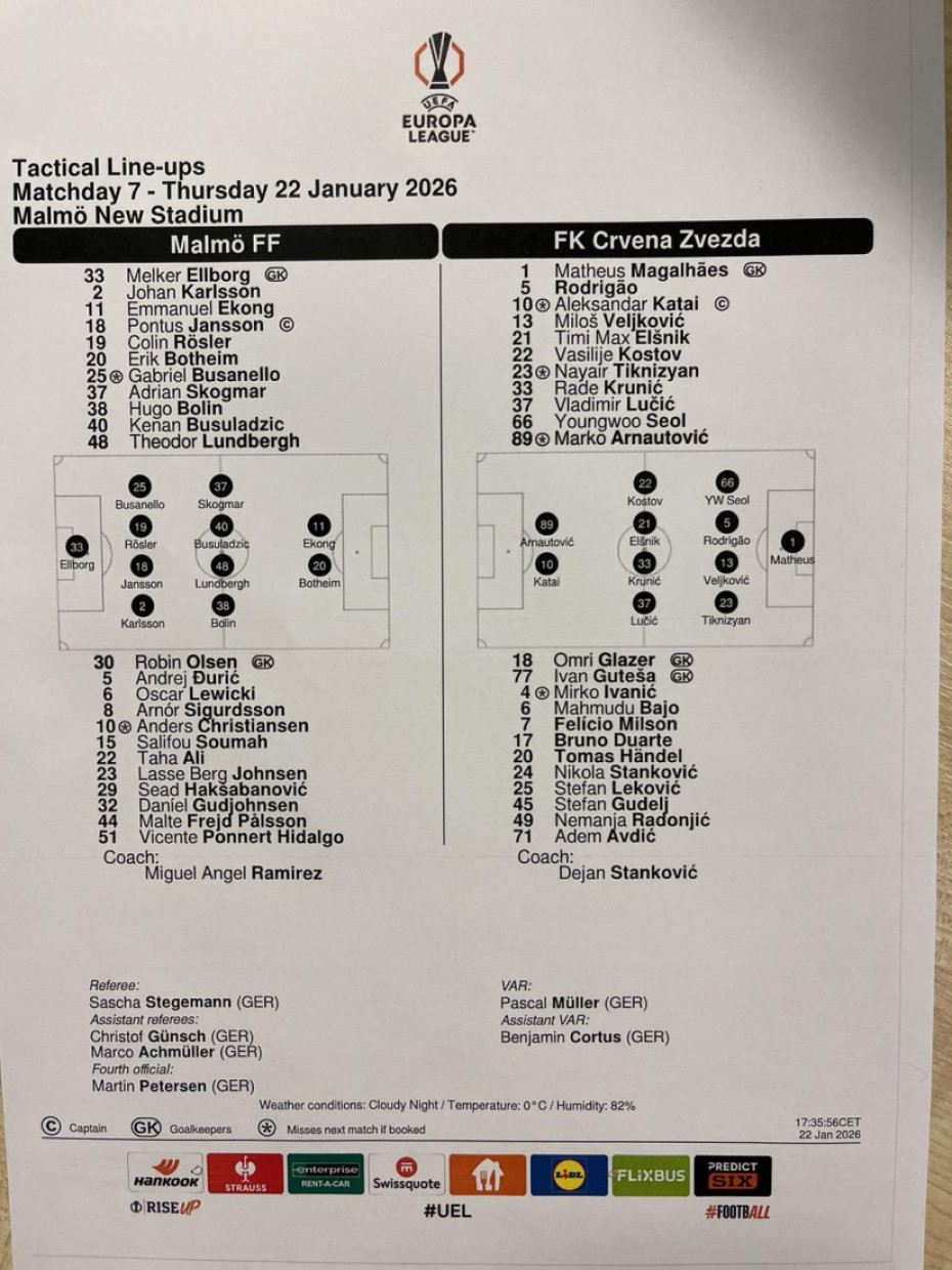 17.26 - Crveno-beli se trenutno nalaze na 17. mestu na tabeli Lige Evrope sa 10 bodova, dok je Malme na 34. poziciji sa jednim bodom. U nokaut fazu idu 24 ekipe. Ovako izgleda tabela: