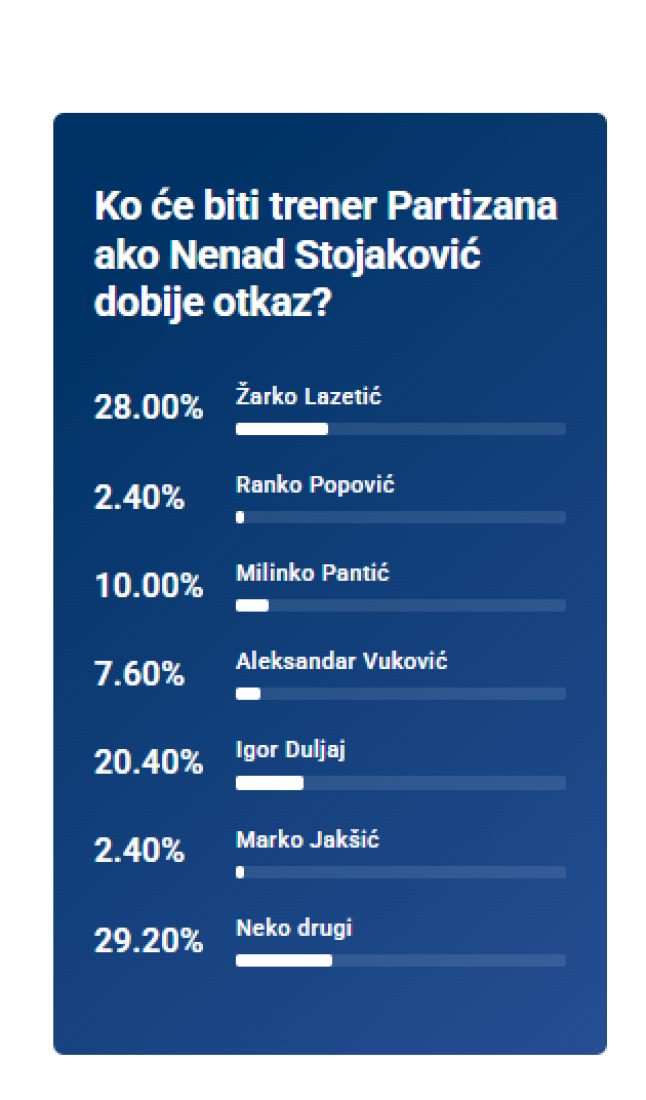 Nagađa se o trenerima koji bi mogli da naslede Nenada Stojakovića, a najčešće se pominju Žarko Lazetiić, Igor Duljaj, Milinko Pantić, Aleksandar Vuković, Ranko Popović i Marko Jakšić. Zanimljivo je da čak 29,20 odsto priželjkuje neko drugo rešenje na klupi Partizana. Navijači bi najrade da dođe Žarko Lazetić, za tu opciju je u anketi na našem portalu glasalo 28 odsto, ali će im želja teško biti ispunjena. Nekadašnji ofanzivac crno-belih i bivši trener TSC-a i Makabija iz Tel Aviva početkom godine otpušten je sa mesta trenera izraelskog kluba. S obzirom na prevremeni raskid, klub iz Tel Aviva dužan je da mu isplaćuje novac sve do trenutka kada istekne prvobitno potpisani ugovor. Crno-beli su u ozbiljnoj finansijskoj krizi, pa svakako ne bi imali novac da izjednače ponudu za Lazetića.