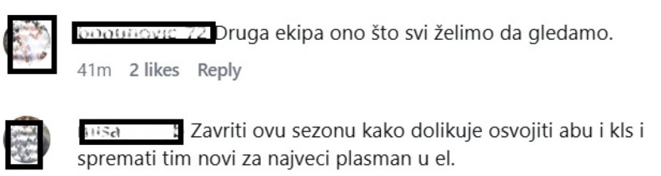 "Odlična igra. I puna Zetra. Bez ijedne uvrede. A Bosna će doći na svoje", "16 trojki, auuu", "Samo se brinem za Fernanda, inače momci bravooooo za večeras", "Svaka čast momci, hoće neko da nam kaze kako je Brunoo koliko je loše?", "Budi se Milton to će značiti jer je Vos jako sebičan, samo da Bruno bude ok i da zgazimo cigane kad im najviše bude trebalo na njihov teren da plače plastika iz Železnika","Bravoooo momci obozavam da vas vidim tako nasmejane", "Druga ekipa ono što svi želimo da gledamo", "Završiti ovu sezonu kako dolikuje osvojiti abu i kls i spremati tim novi za najveci plasman u EL", "Bravo momci, ali niste baš morali toliku razliku", komentari su navijača Partizana na društvenim mrežama.