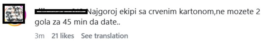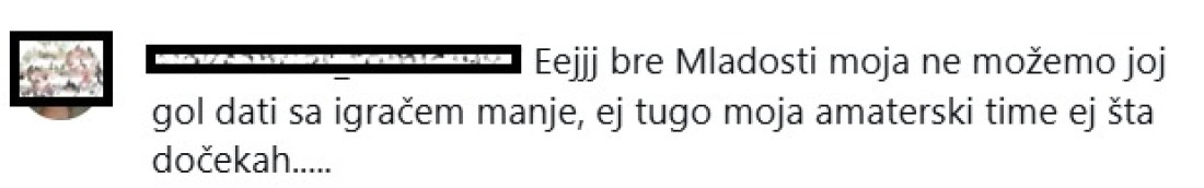"Ejj bre Mladosti moja ne možemo joj gol dati sa igračem manje, ej tugo moja amaterski time ej šta dočekah","Najgoroj ekipi sa crvenim kartonom,ne mozete 2 gola za 45 min da date", "Nisam siguran da u ovom trenutku mozemo da pobedimo tim iz druge lige. Ovo je dno dna", "Eto ako njih nije sramita, mene jeste.Vukotić je uputio 50 centaršuteva u šesnaesterac i ni jednom ni jedan naš igrač nije dohvatio loptu. Neverovatno. Možemo o Seku da pričamo šta hoćemo, ali on jedini može da napravi neki višak i da kreira neku šansu", "Eto ako njih nije sramita, mene jeste.Vukotić je uputio 50 centaršuteva u šesnaesterac i ni jednom ni jedan naš igrač nije dohvatio loptu. Neverovatno. Možemo o Seku da pričamo šta hoćemo, ali on jedini može da napravi neki višak i da kreira neku šansu", "Šta to beše golman? Sijaset ovakvih gluposti od golova smo se naprimali ove sezone", "Bolje da se ne igra Evropa,poceti od trece lige kao rad".