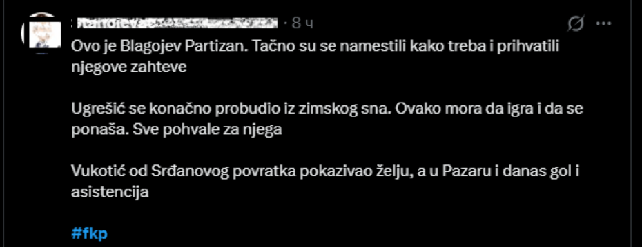 "Bravo Andrej", "Bravo mali", "Bravo junače", "Samo domaci igraci, terajte poltera napolje", "Ovo je Blagojev Partizan. Tačno su se namestili kako treba i prihvatili njegove zahteve. Ugrešić se konačno probudio iz zimskog sna. Ovako mora da igra i da se ponaša. Sve pohvale za njega. Vukotić od Srđanovog povratka pokazivao želju, a u Pazaru i danas gol i asistencija, komentari su navijača Partizana na društvenim mrežama.