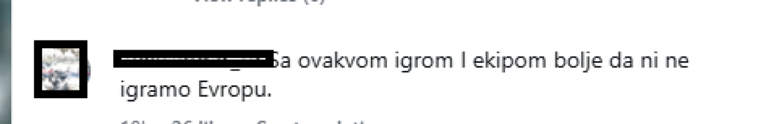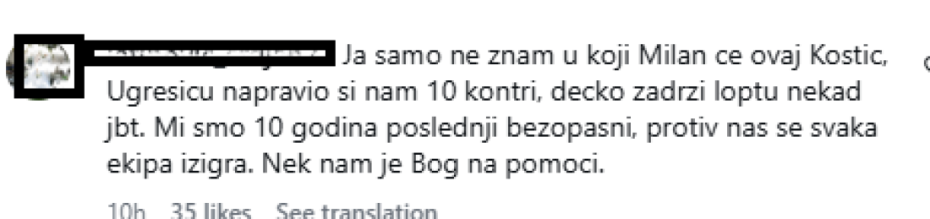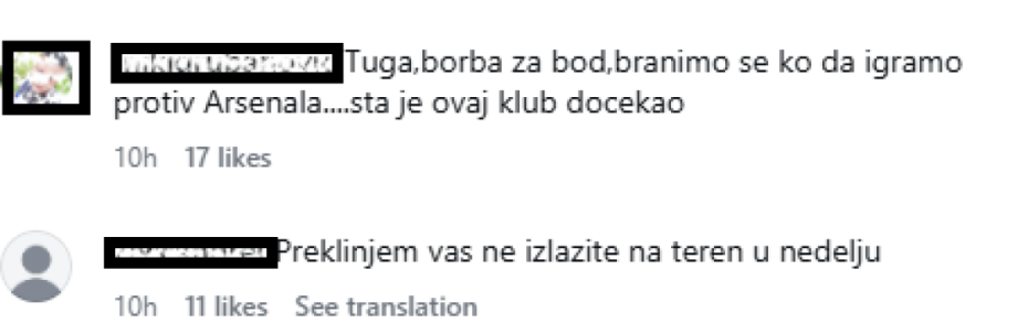 "Bolje da ne izlazimo u nedelju, ima da se izblamiramo", "Hoćemo u nedelju izaći na teren?", "Tugo moja kome da te pričam", "Ja samo ne znam u koji Milan će ovaj Kostic, Ugrešiću napravio si nam 10 kontri, dečko zadrži loptu nekad jbt. Mi smo 10 godina poslednji bezopasni, protiv nas se svaka ekipa izigra. Nek nam je Bog na pomoći", "U nedelju nam je potreban pun jug, inače nam preti petarda u rupi i to će biti dobro ako bude samo petarda. Ovo je jadno, da jadnije ne može biti. Ima li kraja ovoj agoniji…", "Sa ovakvom igrom I ekipom bolje da ni ne igramo Evropu.", "Tuga,borba za bod,branimo se ko da igramo protiv Arsenala.... Šta je ovaj klub dočekao", "Preklinjem vas ne izlazite na teren u nedelju", "Ponovo ćemo popiti nekoliko komada, na žalost", samo su neki komentari navijača na društvenim mrežama.