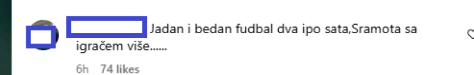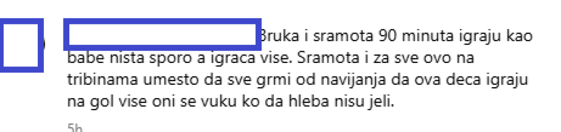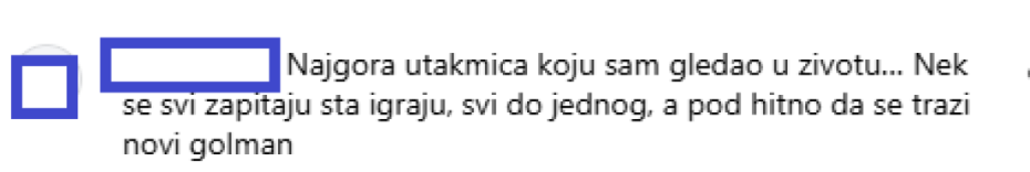 "Jadan i bedan fudbal dva i po sata. Sramota sa igračem više", "Najgora utakmica koju sam gledao u životu… Nek se svi zapitaju sta igraju, svi do jednog, a pod hitno da se traži novi golman", "I još jedna stvar, očajni smo kao navijači, pričamo nešto za cigane, a mi još gori", "Bruka i sramota", "Katastrofalna igra", "Bruka i sramota 90 minuta igraju kao babe ništa sporo, a igraća više. Sramota i za sve ovo na tribinama umesto da sve grmi od navijanja da ova deca igraju na gol više oni se vuku ko da hleba nisu jeli", samo su neki komentari na društvenim mrežama.