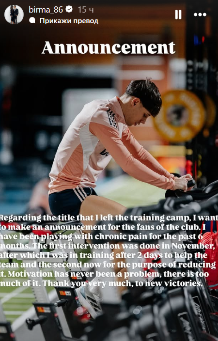 "Želim da se obratim navijačima povodom informacija da sam samoinicijativno napustio pripreme. U poslednjih šest meseci sam igrao u hroničnim bolovima. Prva intervencija obavljena je u novembru, i posle dva dana sam se vratio na treninge da pomognem timu. Druga intervencija je obavljena nedavno, u svrhu smanjena bola. Motivacija nikad nije problem, ima je mnogo. Hvala puno svima. Do novih pobeda."
