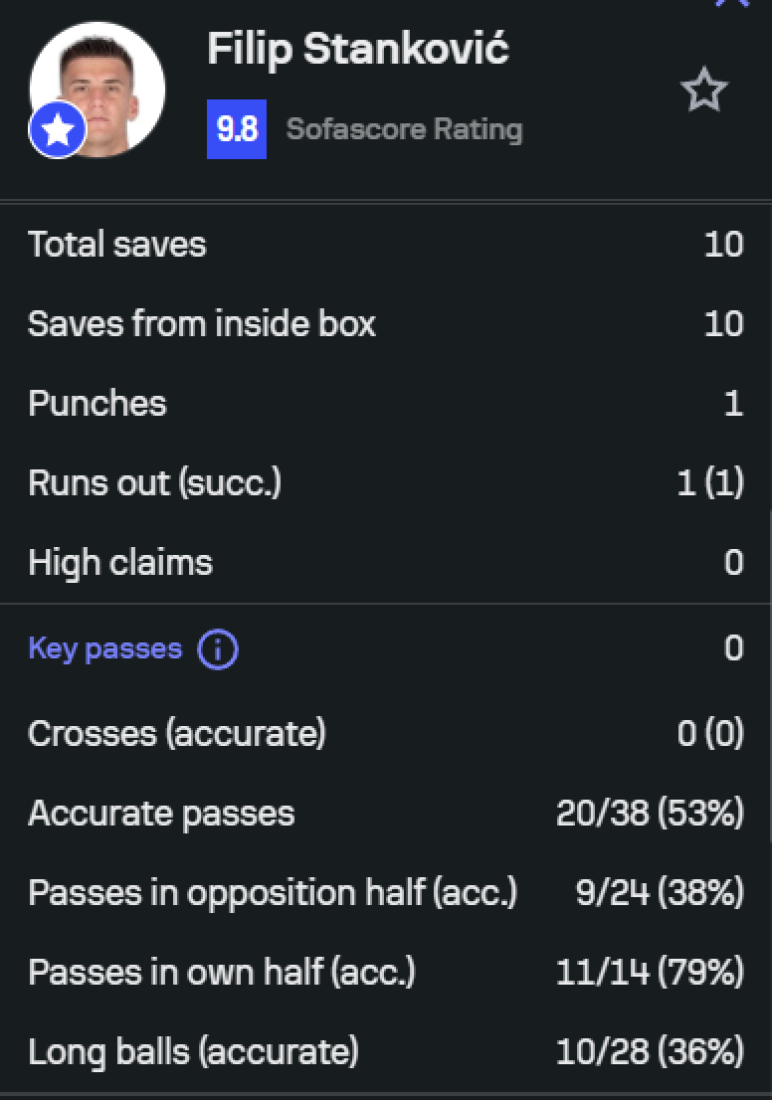 U drugom poluvremenu Stanković je imao više ključnih intervencija i sačuvao mrežu do kraja susreta, čime je omogućio svom timu da zadrži prednost.