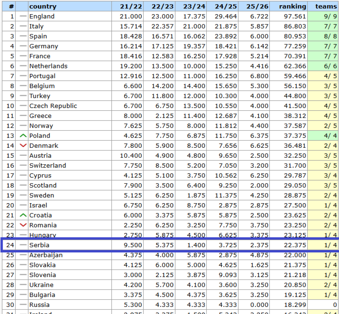 Za vrat Srbiji diše Azerbajdžan koji je na 25. poziciji sa 22,000 bodova, ali ima Karabah u Ligi šampiona i startovao je pobedom u eliti protiv Benfike 3:2, dok je bio bolji i od Kopenhagena sa 2:0 u drugom kolu, pa nam ozbiljno preti. Slovačka je blizu sa 21,375 bodova, u drugom kolu je Slovan Bratislava požena od Strazburga (2:1) dok je Slovenija 27. sa 21,318 bodova, Celje je slavio u meču sa AEK-om 3:1 takođe u Ligi Konferencija. Takođe, ne bi bilo iznenađenje da Ukrajina sa dva kluba u Ligi konferencije zapreti Srbiji. Trenutno ima 20,850 bodova, a u drugom kolu Šahtjor je pobedio Aberdin 3:2, dok je Dinamo Kijev poražen 2:0 od Kristal Palsa.