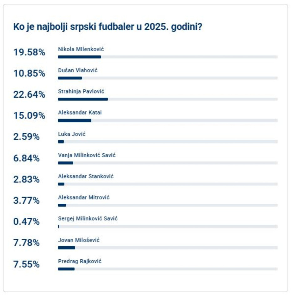 Drugo mesto u anketi pripalo je Nikoli Milenkoviću, koji je osvojio 19,58 odsto glasova. Defanzivac Notingem Foresta nedavno je i zvanično proglašen za najboljeg fudbalera godine u izboru Fudbalskog saveza Srbije. U prvoj polovini 2025. godine, odnosno u završnici sezone 2024/25, Milenković je odigrao čak 37 utakmica u Premijer ligi i postigao pet golova, što mu je donelo priznanje za igrača sezone u svom klubu. Sjajne partije nastavio je i u jesenjem delu sezone 2025/26 – do decembra je nastupio na svih 18 ligaških mečeva, bez ijednog propuštenog minuta (ukupno 1.620), uz četiri žuta kartona i značajan doprinos u tri utakmice u kojima je Forest sačuvao mrežu. Upisao je i jedan pogodak u Ligi Evrope.