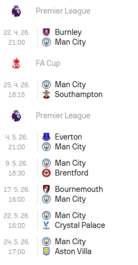 Mančester siti u narednim danima igra protiv Barnlija u gostima, a zatim ga očekuje duel u FA kupu protiv Sautemptona. U prvenstvu potom slede utakmice sa Evertonom na strani, Brentfordom kod kuće, Bornmutom u gostima i Aston vilom na "Etihadu".