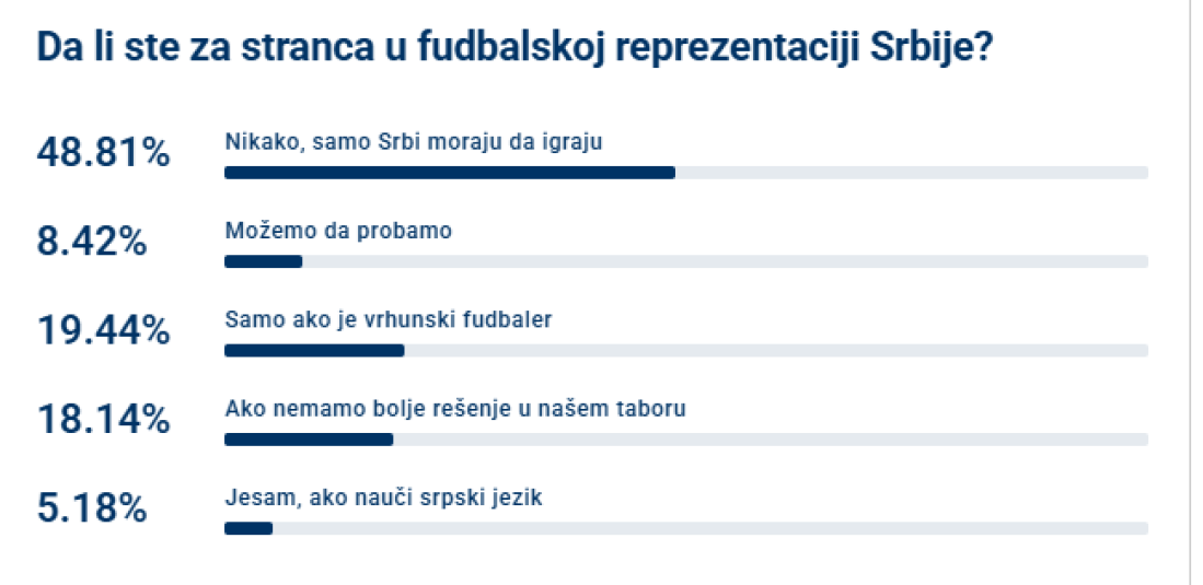 Mi smo poslušali selektora, a Srbija se izjasnila na našem portalu. Čak 48,81 odsto anketiranih smatra da za reprezentaciju moraju da igraju samo Srbi, 19,44 odsto bi možda i pristalo ako se radi o vrhunskom fudbaleru, a 18,14 pod uslovom da mi u našem dvorištu nenamo boljeg igrača. Manji broj glasača 8,42 bi pružilo šansu, da vide kako idu stvari sa strancem u ekipi, dok bi 5,18 odsto pristalo ako nauči srpski jezik.