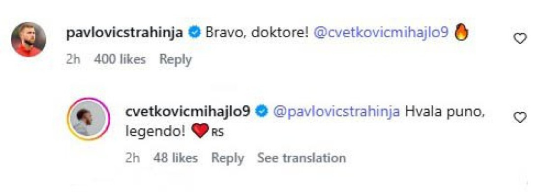 "Bravo, doktore", napisao je Pavlović, na šta je Cvetković odgovorio sa: "Hvala puno, legendo", pa smo ovom kratkom razmenom poruka mogli da zaključimo koliko dobra atmosfera vlada među "orlovima", pa bilo koji uzrast da je u pitanju.