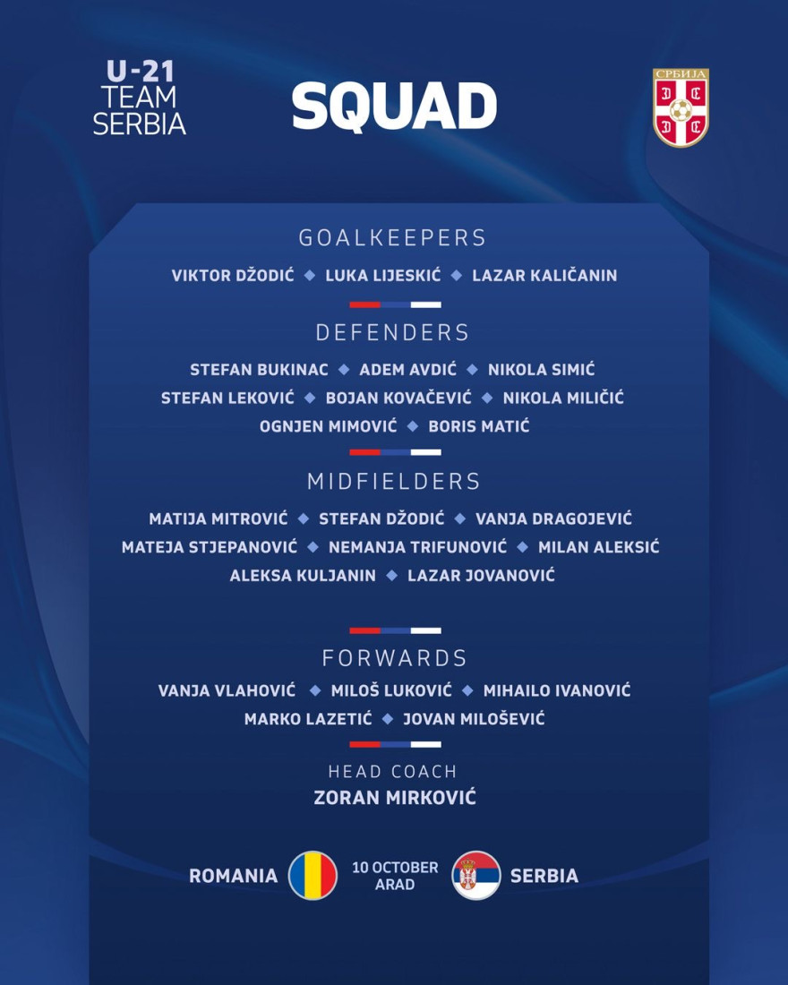 VEZISTI: Matija Mitrović (Vitorija Gimaraeš), Stefan Džodić (Almerija), Vanja Dragojević, Nemanja Trifunović (Partizan), Mateja Stjepanović (Moreirense), Milan Aleksić (Krakovija), Aleksa Kuljanin (Železničar), Lazar Jovanović (Štutgart).