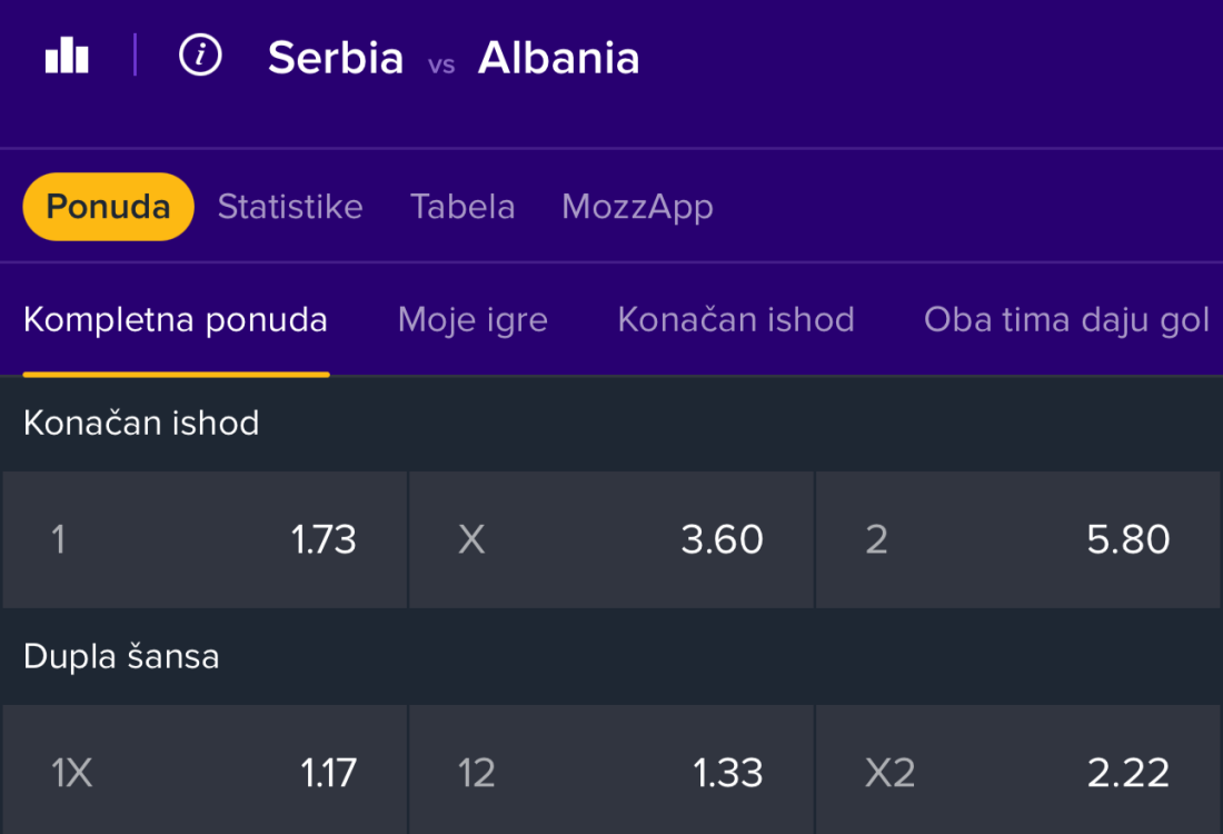 Kada je reč o alternativnim ishodima, kvota da naš nacionalni tim pobedi ili da meč završi bez pobednika iznosi 1,17, dok se isti ishod u korist Albanije procenjuje na oko 2,22.