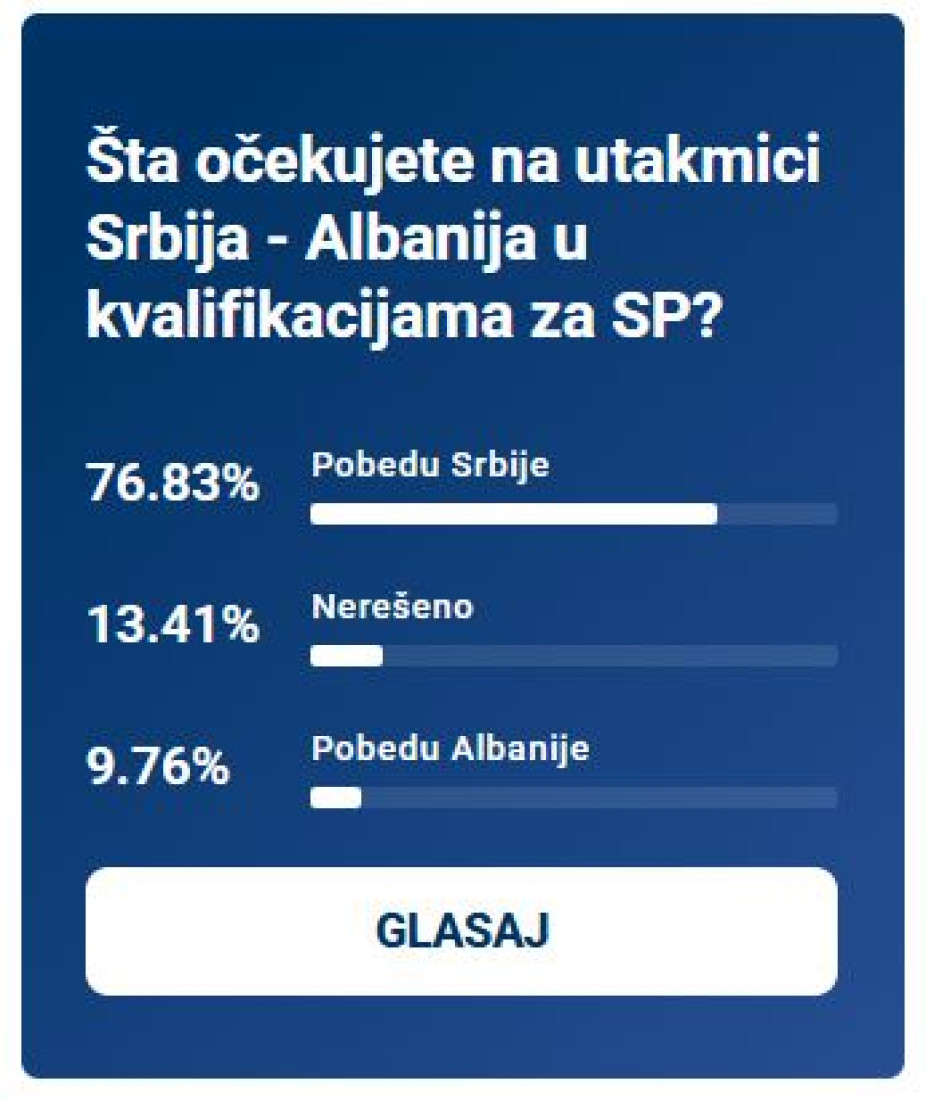 Za nerešen ishod glasalo je 13,41% čitalaca, dok tek 9,76% smatra da bi Albanija mogla da iznenadi i odnese trijumf.