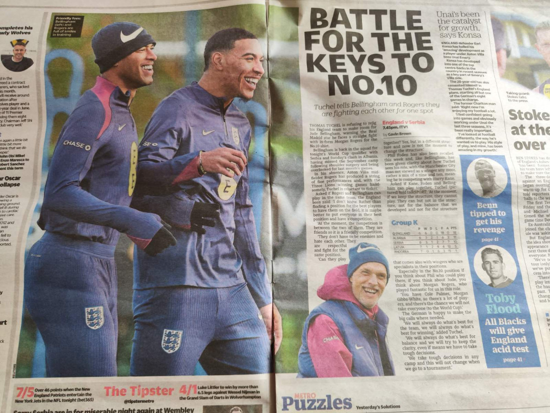 Naime, glavna priča u dnevnoj štampi "Metro" uopšte ne poklanja dve stranice najavi utakmice sa "orlovima", već dilemi u kojoj se selektor Tomas Tuhel nalazi na mestu "desetke".