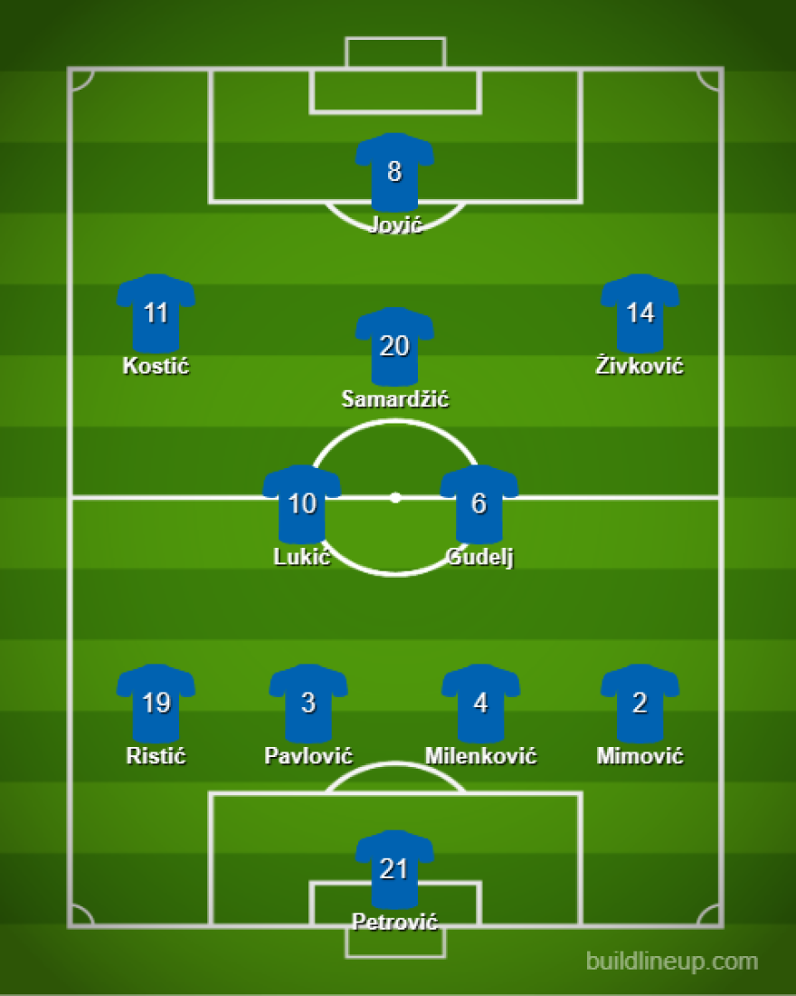 Očekuje se da Srbija nastupi u formaciji 4-3-3 sa Petrovićem na golu. U odbrani bi, prema prvim projekcijama, trebalo da igraju Strahinja Pavlović i Nikola Milenković kao centralni defanzivci, dok bi bekovske pozicije trebalo da pokriju Ognjen Mimović i Mihajlo Ristić.