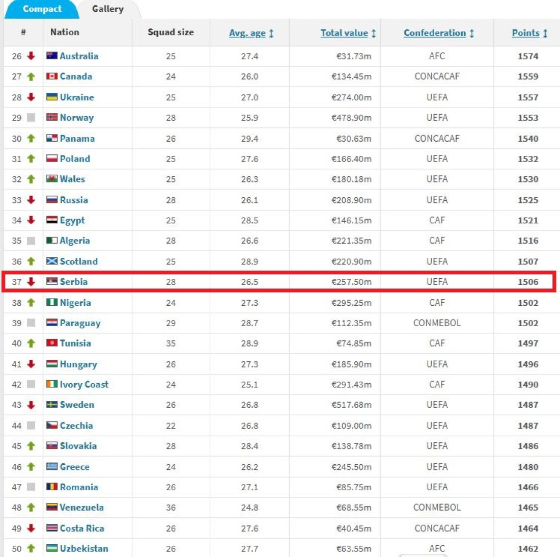 Izabranici Veljka Paunovića nazadovali za jednu poziciju u odnosu na prethodnu listu od 17. oktobra, kada su bili 36, uz gubitak 1,5 bodova.
