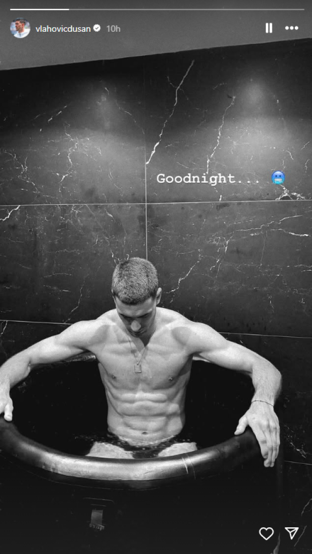 Posle meča javio se na Instagramu, objavio je na storiju odbnaženu fotografiju iz kade sa hladnom vodom dok se oporavljao nakon utakmice. Naravno, oduševio je ženski deo fanova. Pokazao je Dušan brutalne mišile, pa su dame ostale bez teksta.