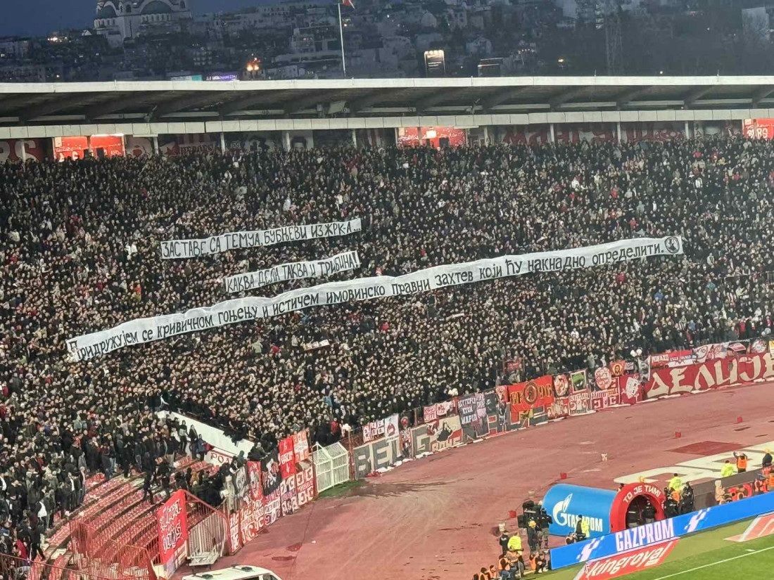 Pristalice Crvene zvezde su na severnoj tribini istakle veliki transparent kojim su prozvale navijače Partizana, aludirajući na dešavanja pred derbi.