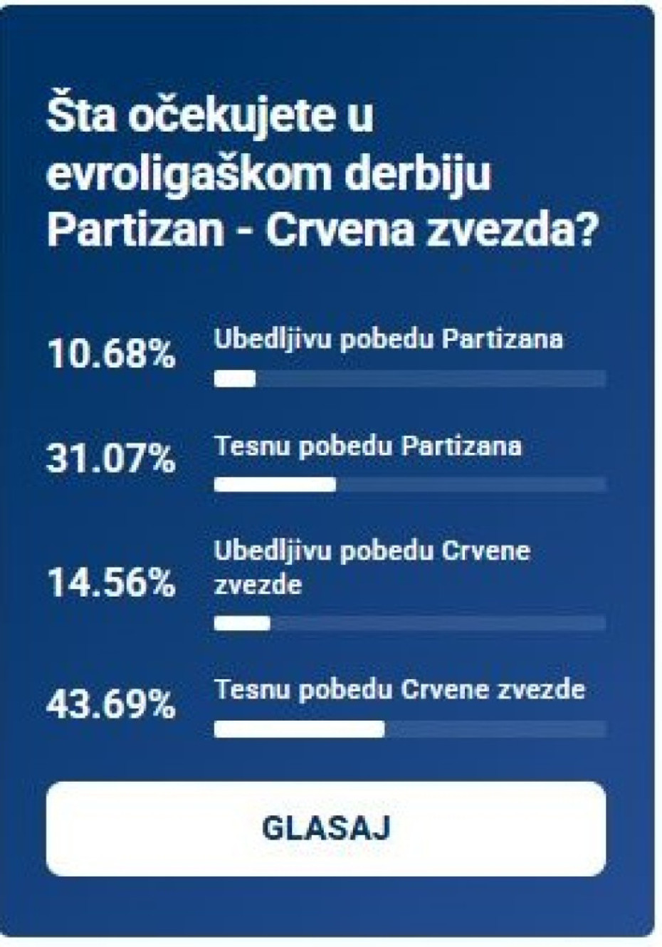 Dalje, 14,56% glasača smatra da bi ekipa Saše Obradovića mogla da dođe do ubedljivog i sigurnog slavlja, dok 10,68% anketiranih očekuje da crno-beli ostvare dominantan trijumf.