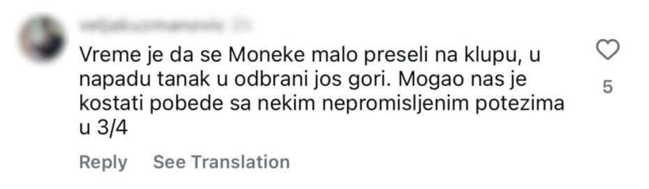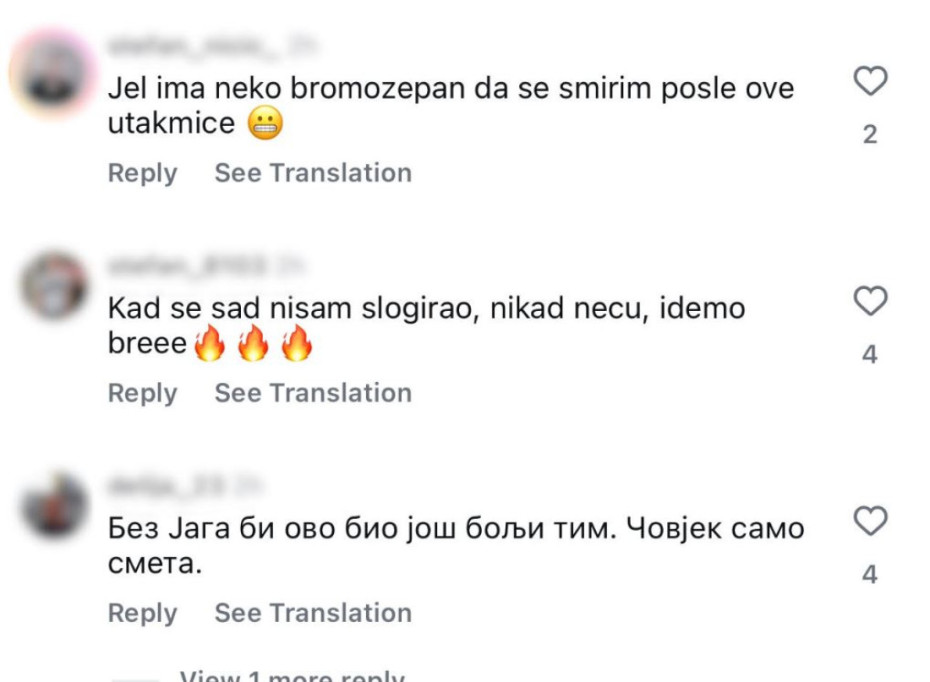 “Nije za osobe sa srčanim oboljenjima”, “Vreme je da se Moneke malo preseli na klupu, u napadu je tanak a u odbrani još gori. Mogao nas je koštati pobede nekim nepromišljenim potezima u trećoj četvrtini”, “Od vas treba ludnicu sastavljati, a ne tim haha”, “Nvora, Batler i Izundu - doživotni ugovor”, “Je l’ ima neko bromazepam da se smirim posle utakmice”, “Kad se sad nisam šlogirao, nikad neću”, “Idemooo, bre”, “Bez Jaga bi ovo bio dosta bolji tim, čovek samo smeta”, samo su neki od komentara zvezdaša na društvenim mrežama.