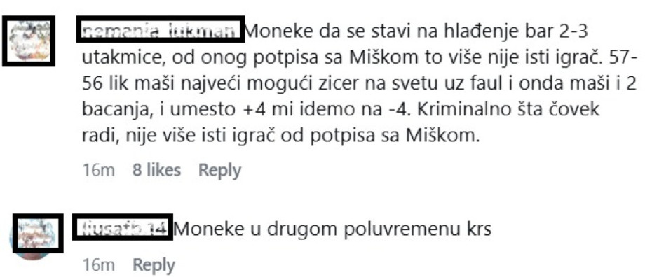 "Moneke da se stavi na hlađenje bar 2-3 utakmice, od onog potpisa sa Miškom to više nije isti igrač, 57-56 lik maši najveći mogući zicer na svetu uz faul i onda maši i dva bacanja, i umesto +4 mi idemo na -4. Kriminalno šta čovek radi, nije više isti igrač od potpisa sa Miškom", "Smanji Monekeu minutazu i dobijamo, sve su pogodili, mora da stane".
