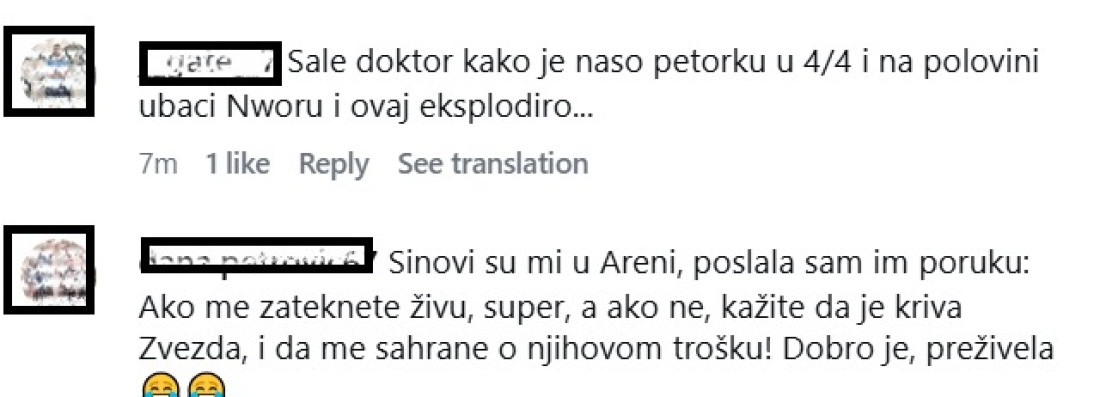 "Koliko god mi skratili ivot, volim vas breeee!!!", "Batler za 6 minuta uradio više nego Jago za čitavu sezonu", "Ma trpaj samooo", "Najlepši rođendanski poklon, hvala ", "Kakva poslednje četvrtina, svaka čast momci i treneru", "Sve je ovo normalno,na spavanje pa da se dobije Makabi", "Rekao sam zeni da cu ici peske za Atinu", "Sale doktor kako je naso petorku u 4/4 i na polovini ubaci Nvoru i ovaj eksplodirao", "Sinovi su mi u Areni, poslala sam im poruku: Ako me zateknete živu, super, a ako ne, kažite da je kriva Zvezda, i da me sahrane o njihovom trošku! Dobro je, preživela".... samo su neki komentari navijača na društvenim mrežama.