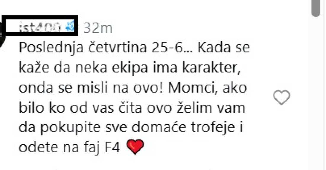"Poslednja četvrtina 25-6... Kada se kaže da neka ekipa ima karakter, onda se misli na ovo! Momci, ako bilo ko od vas čita ovo želim vam da pokupite sve domaće trofeje i odete na faj F4"", oduševljeni su navijači Zvezde posle pobede.