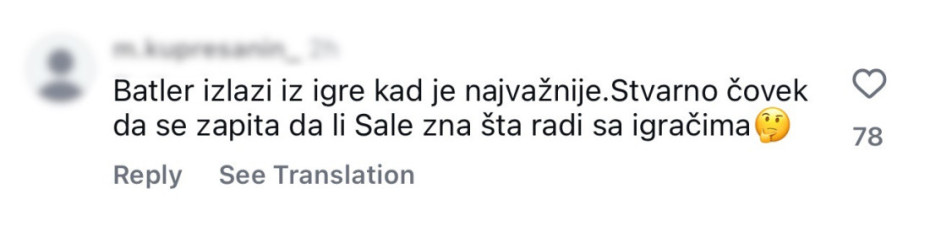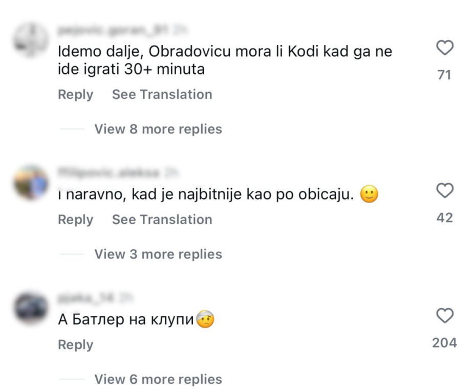 “Obradoviću, mora li Kodi, kada mu ne ide, igrati 30+ minuta”, “Trenerov poraz”, “Ovo će skupo da nas košta”, “Batler izlazi iz igre kada je najvažnije, stvarno čovek da se zapita šta Sale radi”, “Ne može se bez Batlera ništa, mnogo smo tanki kad on nije na parketu”, “Zvezda ako hoće na fajnal-for mora da uruči otkaz Obradoviću”, samo su neki od komentara ogorčenih pristalica srpskog kluba na društvenim mrežama.