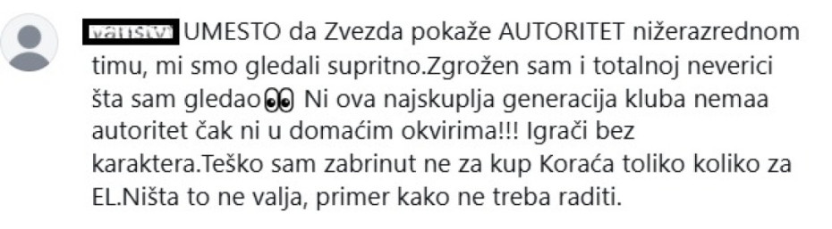 "Bože oprosti od +19 do ovoga", "Kakva ležernost pojednih igrača Kodiju se ne igra uopšte gubi lopte pravi faulove vodiš 20 razlike i ovakvoj ekipi Čacka dozvoliš vraćanje. Dobric totalno van utakmice ,Miljenovic dokazuje da ne može ozbiljnu kosarku igrati uopšte zavarava sebe i nabijače Zvezde", "Moraće veći fokus, ne sme onakav pad u igri", "Umesto da Zvezda pokaže autoritet nižerazrednom timu, mi smo gledali suprotno. Zgrožen sam i totalnoj neverici šta sam gledao. Ni ova najskuplja generacija kluba nemaa autoritet čak ni u domaćim okvirima! Igrači bez karaktera. Teško sam zabrinut ne za Kup Koraća toliko koliko za EL. Ništa to ne valja, primer kako ne treba raditi", nezadovoljni su navijači Zvezde.