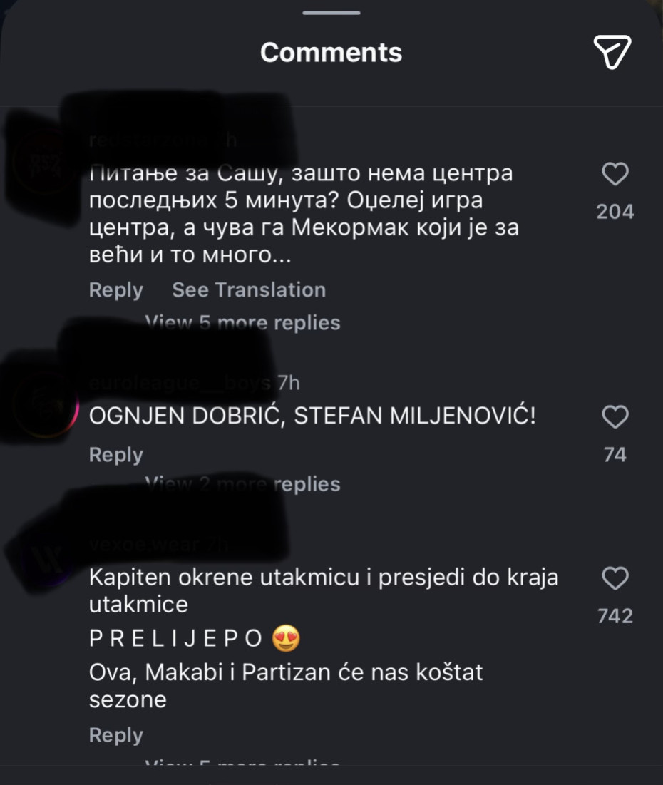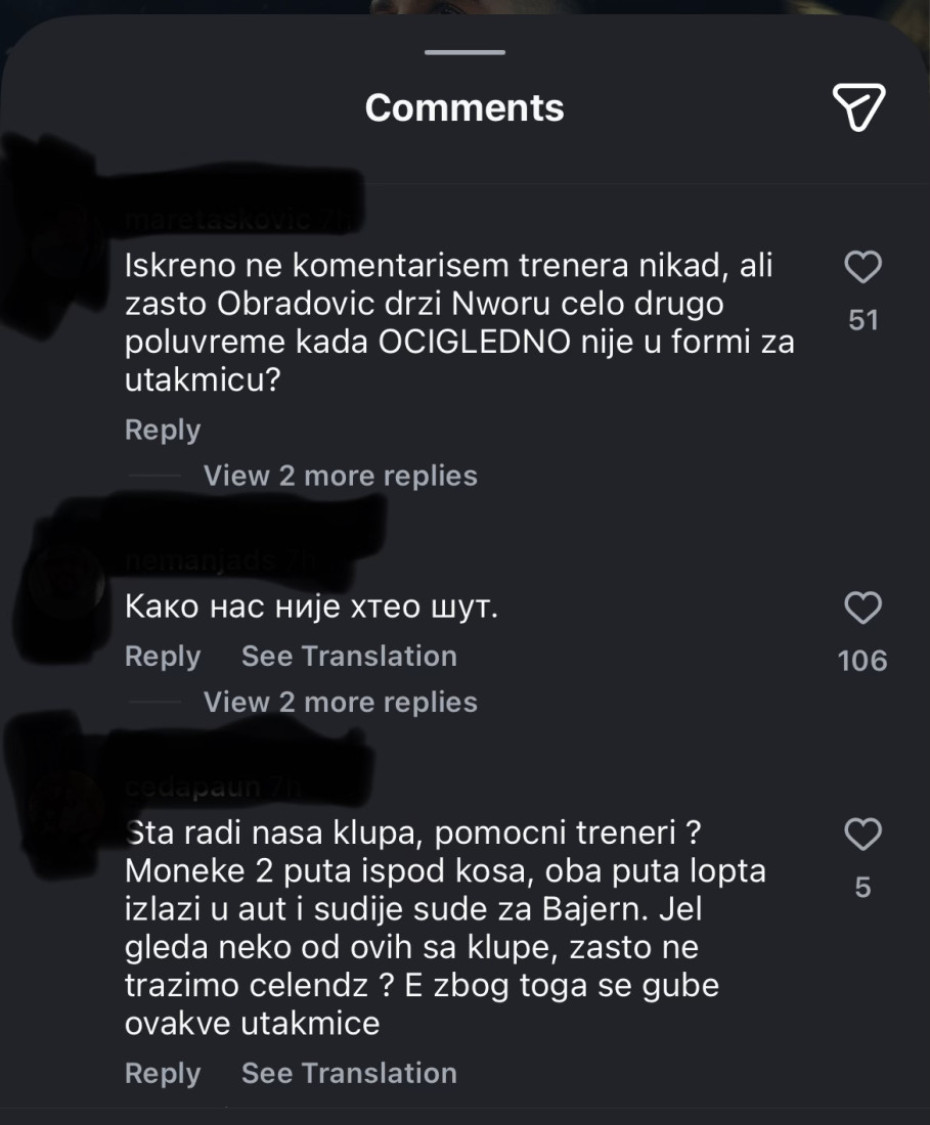 "Iskreno, ne komentarišem trenera nikad, ali zašto Obradović drži Nvoru celo drugo poluvreme na terenu? Šta radi naša klupa, pomoćni treneri? Moneke dva puta ispod koša, oba puta lopta izlazi u aut i oba puta za Bajern. Zašto ne tražimo čelendž? Obradović svojim nejasnim rotacijama gubi već ko zna koju utakmicu. Dobrić je okrenuo utakmicu, a ostavljen na klupi", samo su neki od komentara na društvenoj mreži Instagram.