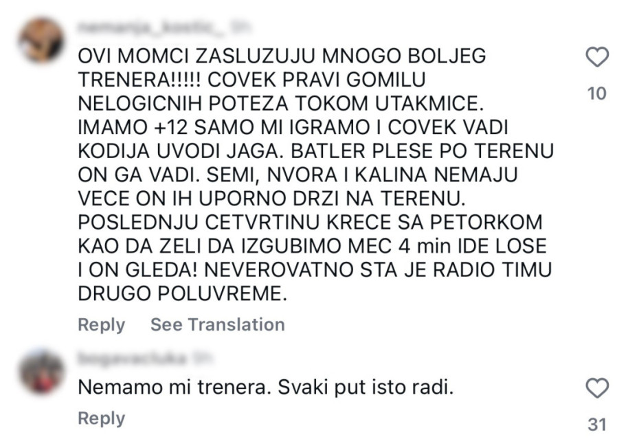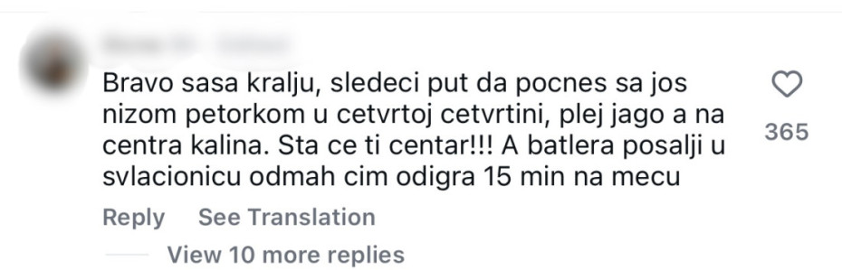 "Ovi momci zaslužuju mnogo boljeg trenera. Čovek pravi gomilu nelogičnih poteza tokom utakmice, kao da želi da izgubimo meč", "Nemamo mi trenera, svaki put isto radi", "Saša 0 od trenera", "Saša Obradović OUT", "Bravo Saša, sledeći put treba da počneš sa još nižom četvorkom u četvrtoj četvrtini, a Džereda Batlera pošalji u svlačionicu čim odigra 15 minuta na meču", samo su neki od komentara nezadovoljnih navijača na društvenim mrežama.