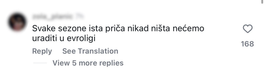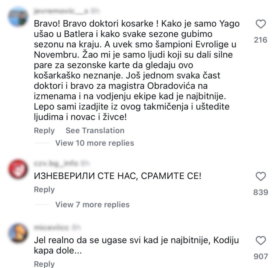 "Svake sezone ista priča, nikada ništa nećemo uraditi u Evroligi", "Da li je realno da se svi ugase onda kada je najbitnije...", "Izneverili ste nas, sramite se", "Bravo doktori košarke, uvek smo mi šampioni Evrolige u novembru. Žao mi je samo ljudi koji su dali novac na sezonske ulaznice da bi gledali ovo košarkaško neznanje. Još jednom bravo za magistra Sašu Obradovića na izmenama i vođenju ekipe u najbitnijim trenucima. Lepo sami izađite iz ovog takmičenja i uštedite ljudima i novac i živce", "Obradoviću otkaz", "Gubitnički mentalitet", "Sale, da se ne ljubimo", "Sale, pojedini igrači, vreme je za rastanak, dosta je bilo", samo su neki od komentara nezadovoljnih simpatizera crveno-belih na društvenim mrežama.